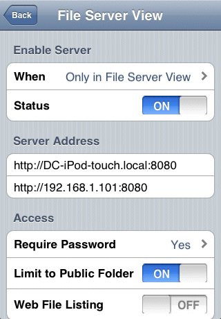 With the above options, the server is active only when you explicitly go to the File Server View and anyone who attempts to access the server must be able to provide the correct user name and password in order to have access to the files through the server.