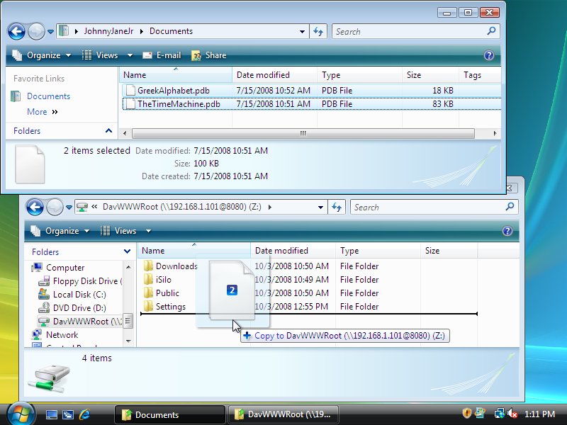 1. We can now open two file explorer windows, one with the files we want to copy and the other with the view of iSilo™'s Documents directory on the drive we just mapped. To copy files, just drag and drop.